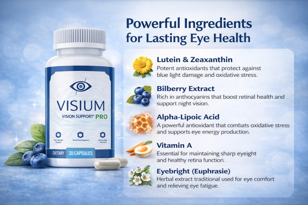 One of the reasons Visium Pro has gained attention is its carefully structured ingredient profile — built around antioxidant protection and microcirculatory support inside the eye.
